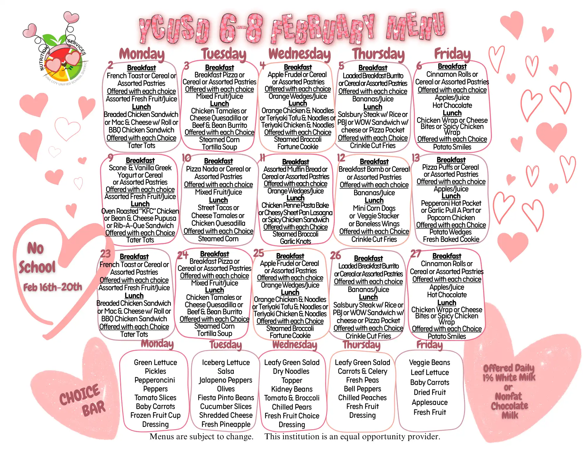 YCUSD Cafeteria Staff encourages students to select the appropriate food components. The CDE MyPlate graphic poster is displayed throughout our cafeterias as a visual guide to assist students in the correct selection of food components and ensure our division's compliance to CDE regulatory requirements.