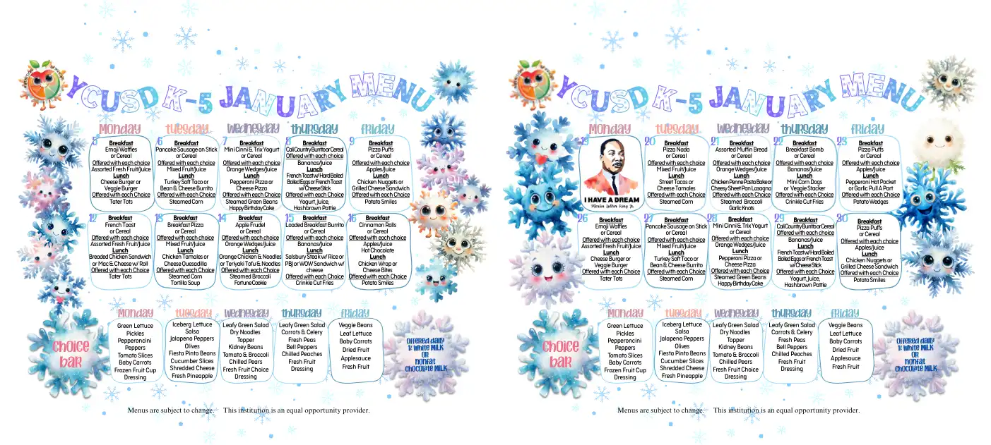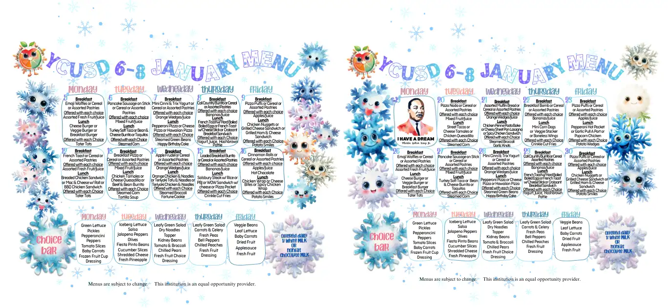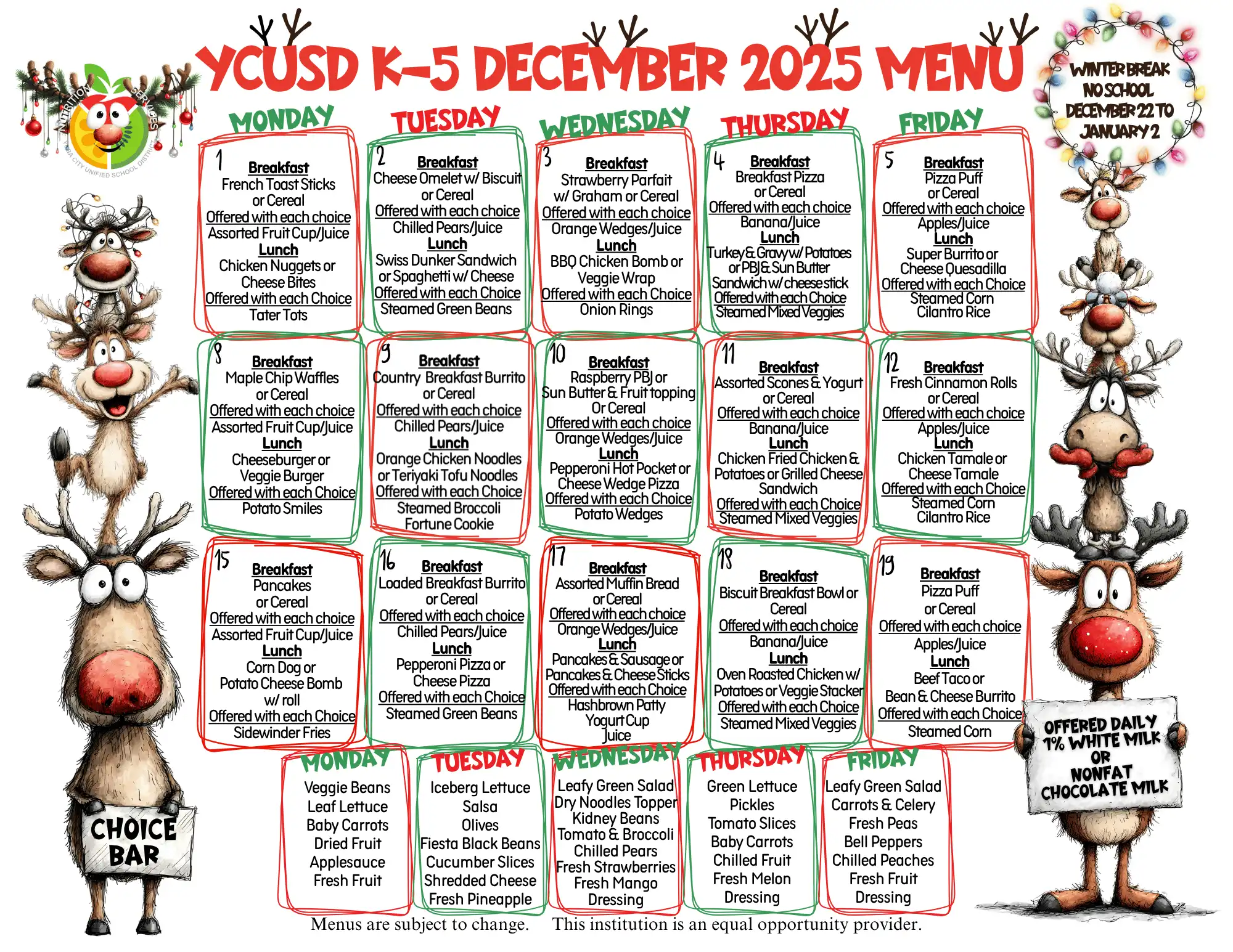 YCUSD Cafeteria Staff encourages students to select the appropriate food components. The CDE MyPlate graphic poster is displayed throughout our cafeterias as a visual guide to assist students in the correct selection of food components and ensure our division's compliance to CDE regulatory requirements.